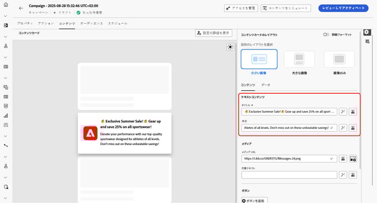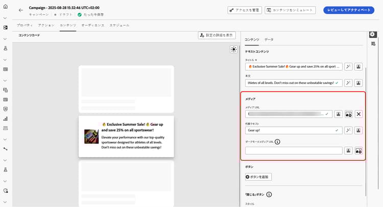 「コンテンツ」タブから直接、コンテンツを定義してメディアやアクションボタンを追加することで、コンテンツカードをカスタマイズできます。