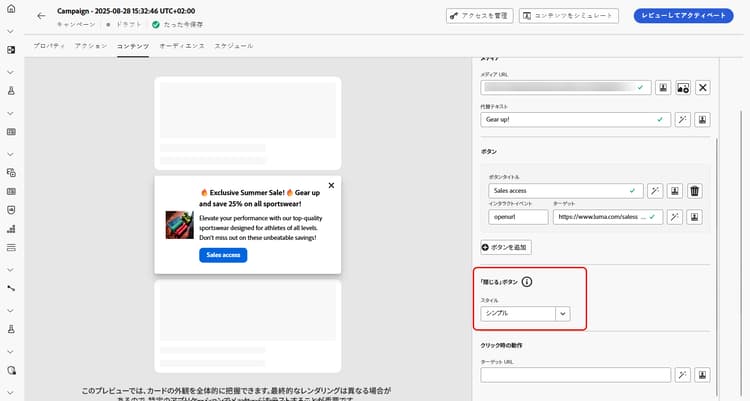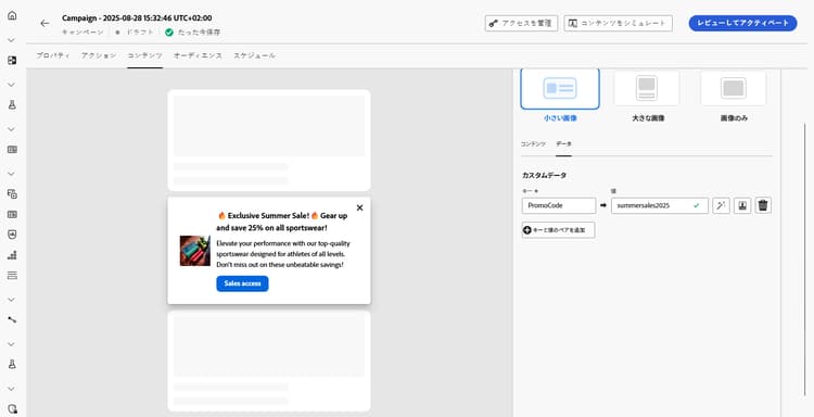 コンテンツを定義し、パーソナライズしたら、レビューしてアクティブ化できます。設定したスケジュールに従ってキャンペーンが送信されます。詳しくは、このページを参照してください。