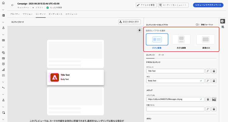 「コンテンツカードのレイアウト」のセクションで、メッセージ要件に応じて、3 つの画像レイアウトオプションのいずれかを選択します。