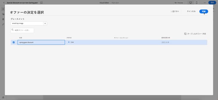 note note NOTE 選択したプレースメントと互換性のある決定のみがリストに表示されます。この例では、「メールのトップ画像」プレースメントに一致するオファーアクティビティは 1 つだけです。
