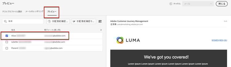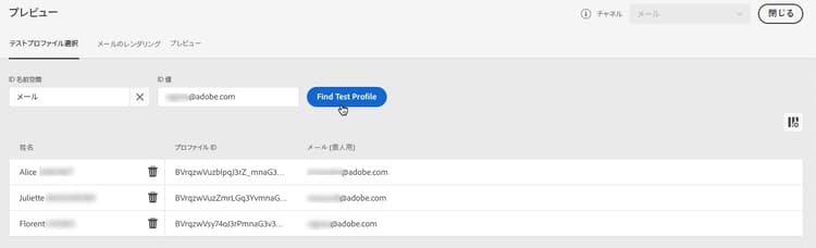 オファーのプレビューに使用するテストプロファイルを選択します。