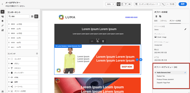 「オファー」セクションまたはコンテンツコンポーネントの矢印を使用して、メールに追加した決定に含まれる様々なオファーをプレビューできます。
