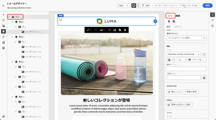 E メールデザイナーから、少なくとも 1 つの 構造コンポーネント を追加して、メールのデザインを開始します。