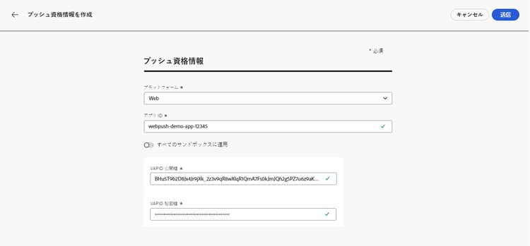 VAPID 公開鍵および 秘密鍵 を入力します。