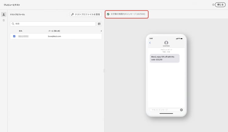 メッセージコンテンツを定義したら、(CSV/JSON ファイルからアップロードした、または手動で追加した)テストプロファイルやサンプル入力データを使用して、そのコンテンツをプレビューできます。パーソナライズされたコンテンツを挿入した場合は、そのコンテンツがメッセージ内でどのように表示されるかを確認できます。