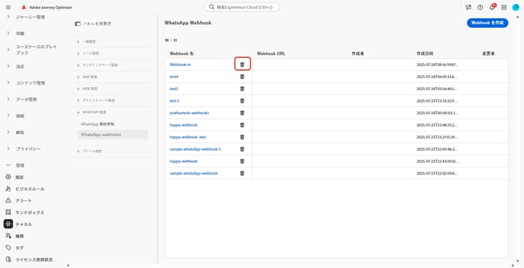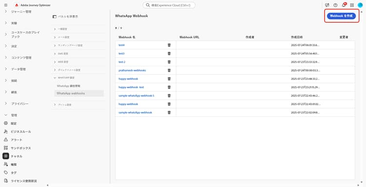 >チャネル に移動し、WhatsApp 設定の下にある WhatsApp Webhook メニューを選択して、「Webhook を作成」ボタンをクリックします。