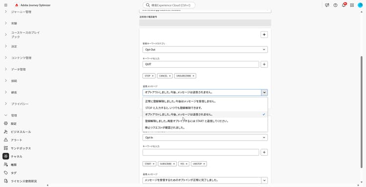 「返信メッセージ」フィールドに、設定済みのキーワードを受信した際に送信されるメッセージを入力するか、ドロップダウンメニューから定義済みのオプションを選択します。
