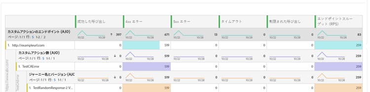 タイムアウト: 最大応答時間を超えたので失敗した呼び出しの数。これは、外部エンドポイントの待ち時間やパフォーマンスの問題を明らかにするのに役立ちます。