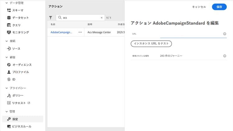 ビルトインの AdobeCampaignStandard アクションを選択します。画面の右側にアクション設定パネルが開きます。