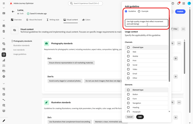 チャネルタイプ:このガイドライン、例外または除外を適用する場所を選択します。例えば、特定の書き込みスタイルをメール、モバイル、プリントまたは他の通信チャネルにのみ表示する場合があります。