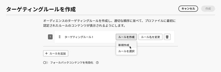 また、ルールを作成/ルールを選択をクリックして、ルールメニューから作成した既存のターゲティングルールを選択することもできます。詳細情報