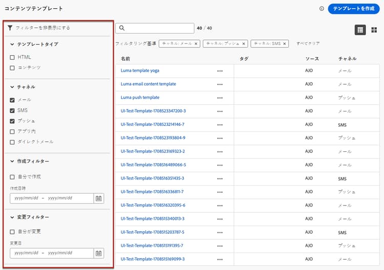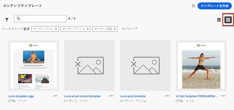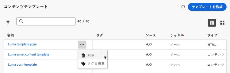 現在のサンドボックスで(「テンプレートとして保存」オプションを使用したジャーニーやキャンペーンから、または コンテンツテンプレート メニューから)作成したすべてのテンプレートが表示されます。詳しくは、テンプレートの作成方法を参照してください。