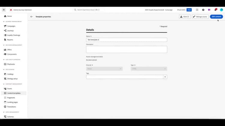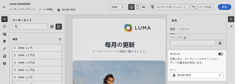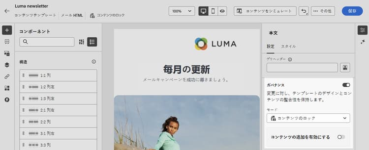 Journey Optimizer では、テンプレート全体をロックするか、特定の構造とコンポーネントをロックして、メールテンプレート内のコンテンツをロックできます。これにより、意図しない編集や削除を防ぎ、テンプレートのカスタマイズをより細かく制御して、メールキャンペーンの効率と信頼性を向上させることができます。