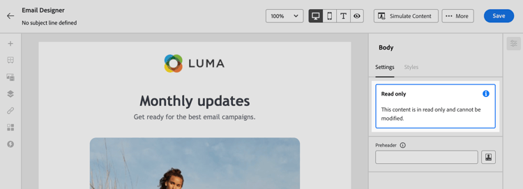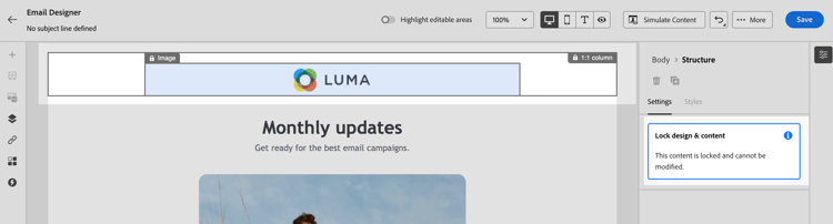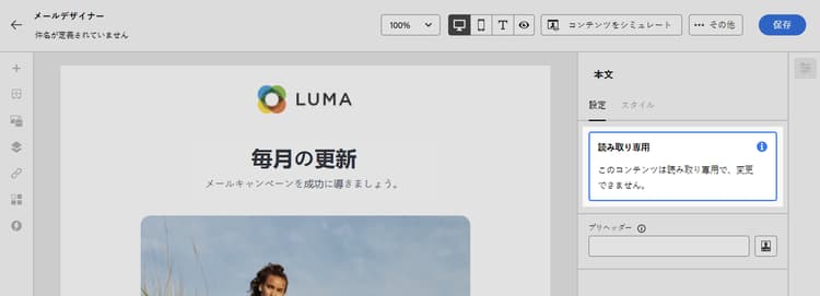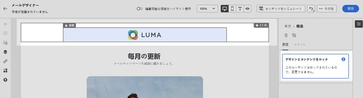 新しいテンプレートの作成中または既存のテンプレートの編集中に、E メールデザイナーでメールテンプレートのコンテンツのロックを直接有効にできます。次の手順に従います。