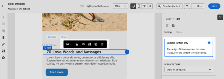 - 編集可能なコンテンツのみ:コンポーネントのスタイルをロックしますが、コンテンツの編集は許可します。
