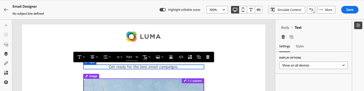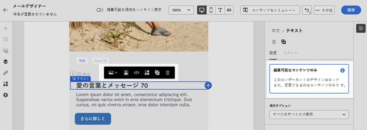 メールテンプレートを開くか作成し、E メールデザイナーのコンテンツ編集画面にアクセスします。