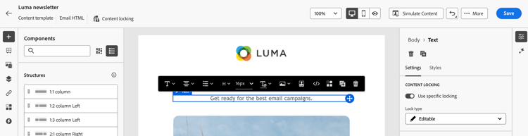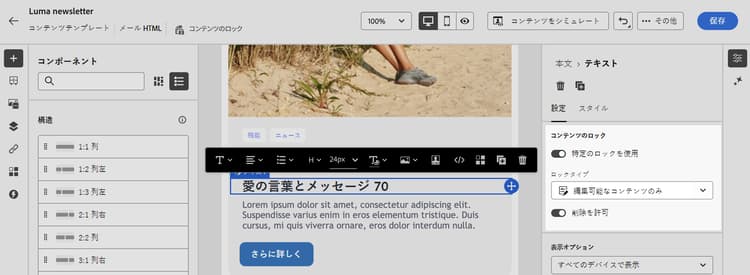 - コンテンツのロック:テンプレート内のコンテンツの特定のセクションをロックします。デフォルトでは、すべての構造とコンポーネントが編集可能になります。その後、個々の要素を選択的にロックできます。