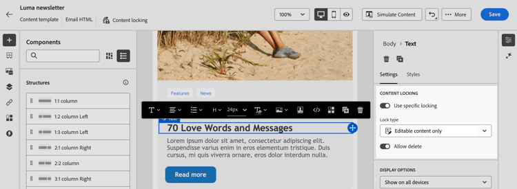 ロックタイプドロップダウンリストで「編集可能」を選択します。スタイルのロック中にコンテンツの編集を許可するには、「編集可能なコンテンツのみ」を選択します。詳しくは、コンポーネントのロック方法を参照してください