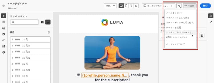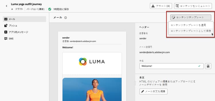 キャンペーンまたはジャーニー内でコンテンツをデザインする際に、テンプレートとして保存する。方法についてはこちらを参照