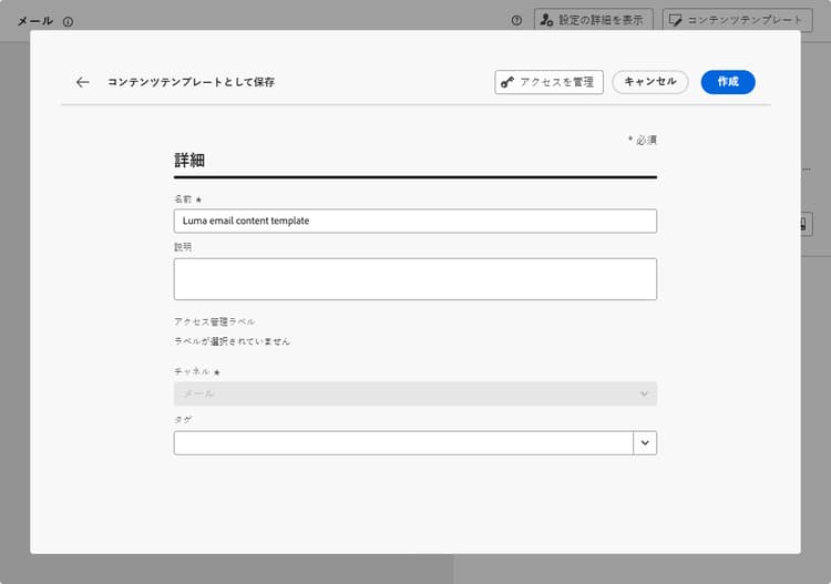 「タグ」フィールドから Adobe Experience Platform タグを選択または作成してテンプレートを分類し、検索の向上を図ります。詳細情報