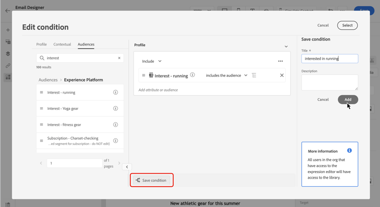 条件付きルールは、パーソナライゼーションエディターを使用して作成し、コンテンツ間で再利用する場合は保存できます。ライブラリに条件付きルールを保存する方法を学ぶ