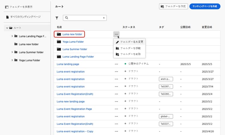 ランディングページを簡単に移動するには、フォルダーを使用して、より効果的に構造化された階層に整理します。これにより、組織のニーズに応じて項目を分類および管理できます。