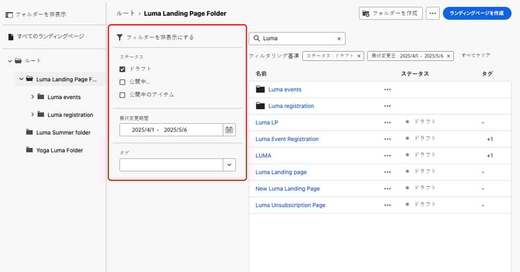 ランディングページは、ステータス、変更日、タグに基づいてフィルタリングできます。
