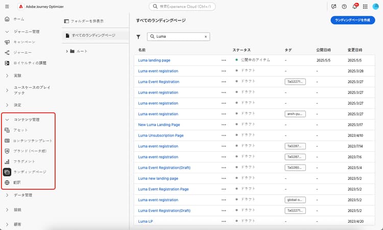 ランディングページのリストにアクセスするには、左側のメニューからコンテンツ管理/ランディングページを選択します。