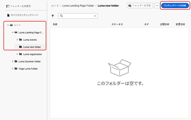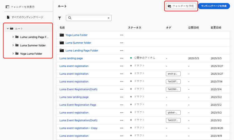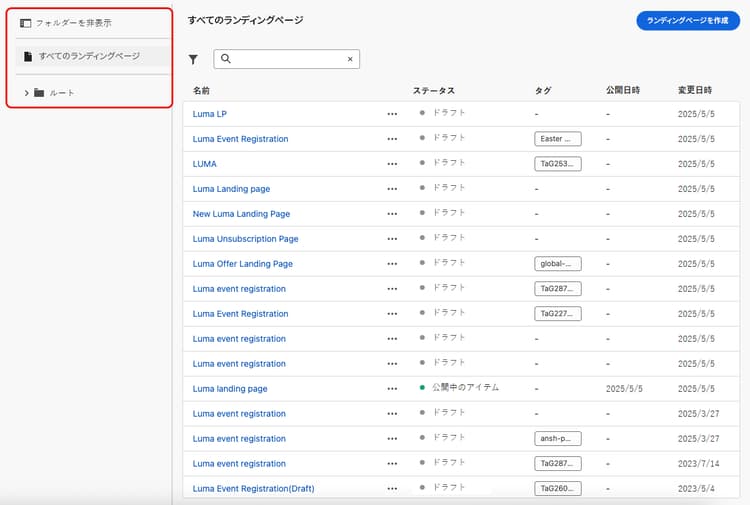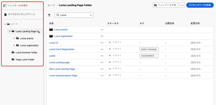 左側のパネルでは、ランディングページをフォルダーに整理できます。デフォルトでは、すべての項目が表示されます。フォルダーを選択すると、選択したフォルダーに含まれるランディングページとフォルダーのみが表示されます。詳細情報