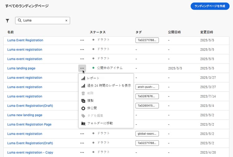 このリストから、ランディングページの横にある「…」をクリックして、目的のアクションを選択できます。