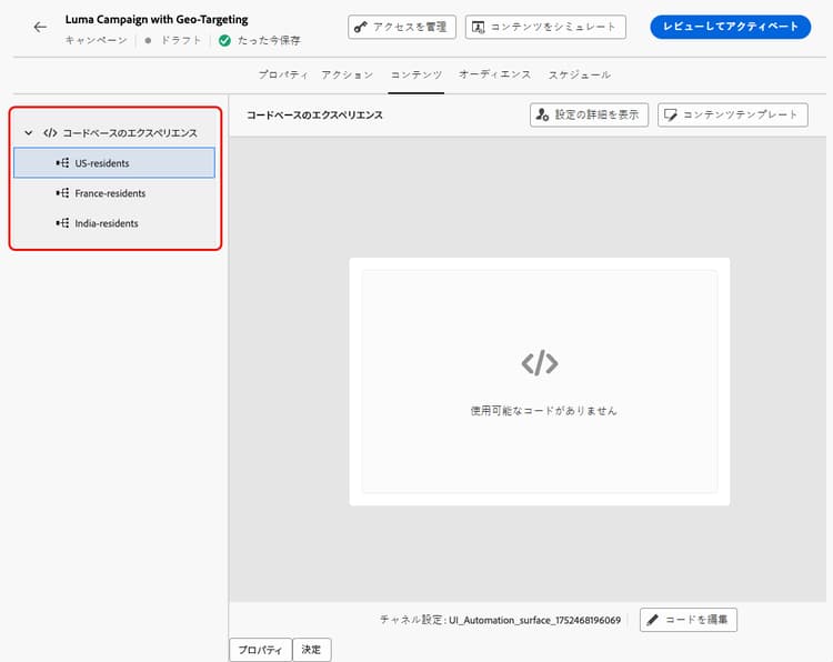 ジャーニー/キャンペーンがライブになると、米国居住者には特定のメッセージ、フランス居住者には異なるメッセージなど、各ターゲットにカスタマイズされたコンテンツが送信されます。