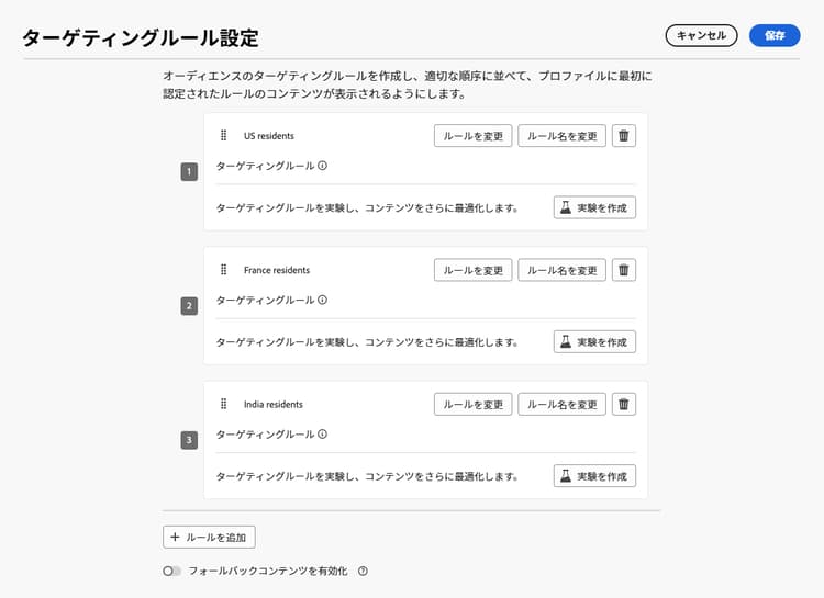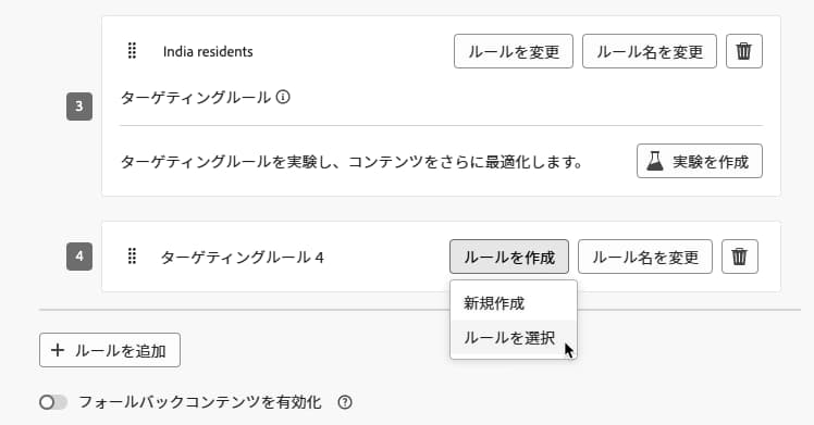 必要に応じて、「フォールバックコンテンツを有効にする」オプションを選択します。フォールバックコンテンツを使用すると、ターゲティングルールが選定されていない場合に、オーディエンスはデフォルトコンテンツを受信できます。