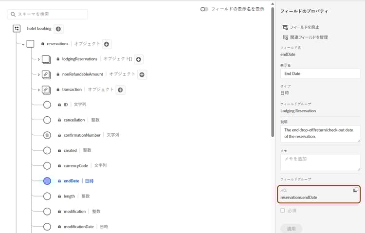 Adobe Experience Platform データセットで呼び出す構文が設定されたら、取得するフィールドを指定できます。構文は以下の通りです。