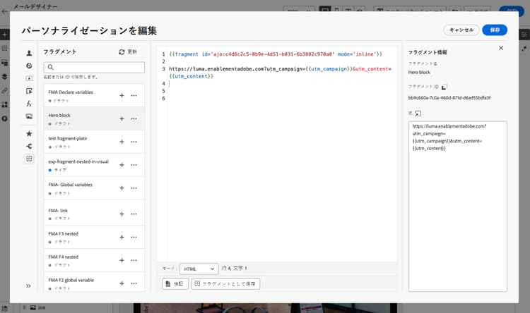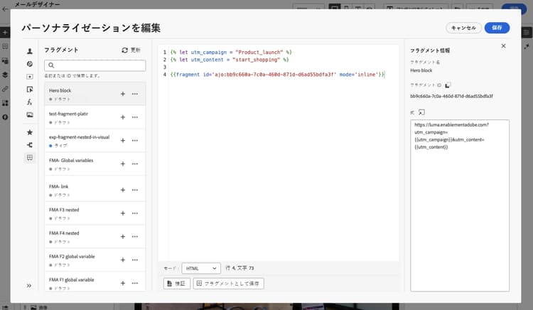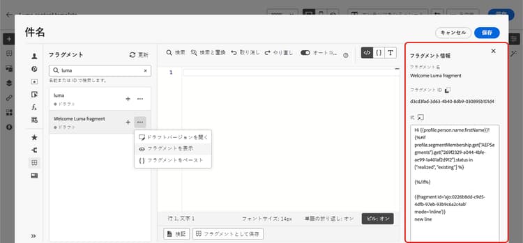 フラグメント ID を追加したら、対応する式フラグメントを開いてインターフェイスから編集すると、変更が同期されます。これらは、そのフラグメント ID を含むすべてのドラフトまたはライブジャーニー/キャンペーンに自動的に生成されます。