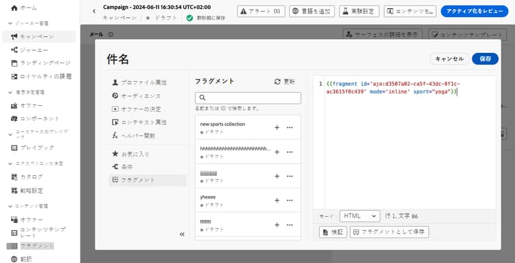 note caution CAUTION 任意の ドラフト または ライブ フラグメントをコンテンツに追加できます。ただし、ジャーニーまたはキャンペーンで ドラフト ステータスのフラグメントを使用している場合、そのジャーニーまたはキャンペーンはアクティブ化できません。ジャーニーまたはキャンペーンの公開時に、ドラフトフラグメントにエラーが表示されるので、公開するには承認する必要があります。 -