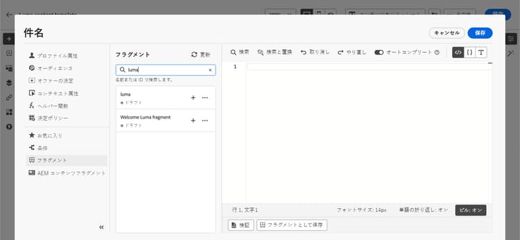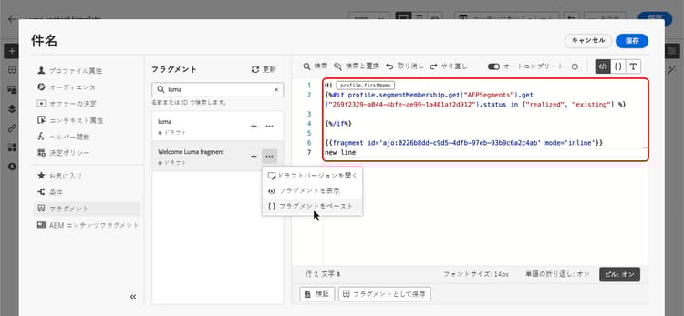 パーソナライゼーションエディターを使用すると、現在のサンドボックスに作成または保存されたすべての式フラグメントを活用できます。