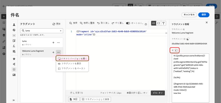 フラグメントの横にある「その他のアクション」ボタンをクリックします。開いたコンテキストメニューから「フラグメントを表示」を選択すると、そのフラグメントに関する詳細情報が表示されます。また、フラグメント ID も表示され、ここからコピーできます。