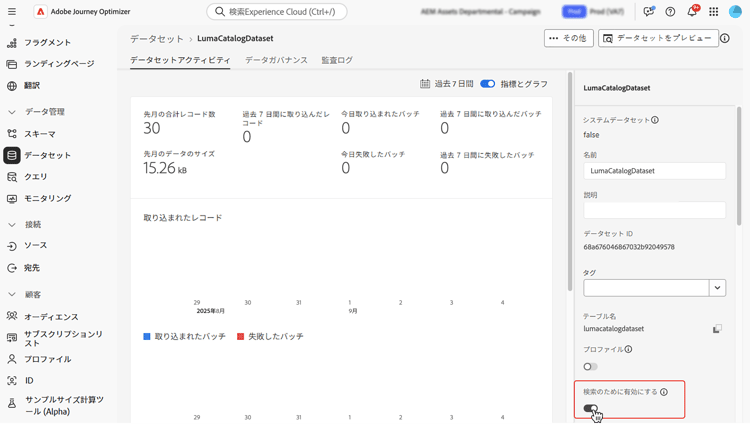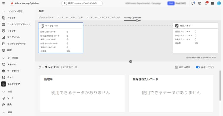 参照用データセットが有効になったら、モニタリングメニューに移動して「Journey Optimizer」タブを選択し、参照サービスへの取り込みステータスを確認できます。
