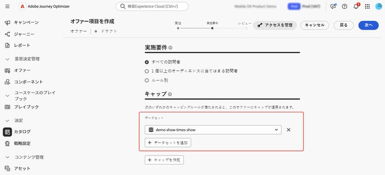 例えば、小売業者は、リアルタイムの製品在庫に基づいてオファーを制限する場合があります。固定しきい値 500 を設定する代わりに、Adobe Experience Platform データセットから「inventory_count」フィールドを参照する式を使用します。データセットに 275 個の項目が在庫に残っていることが示されている場合、オファーはその数までのみ配信されます。