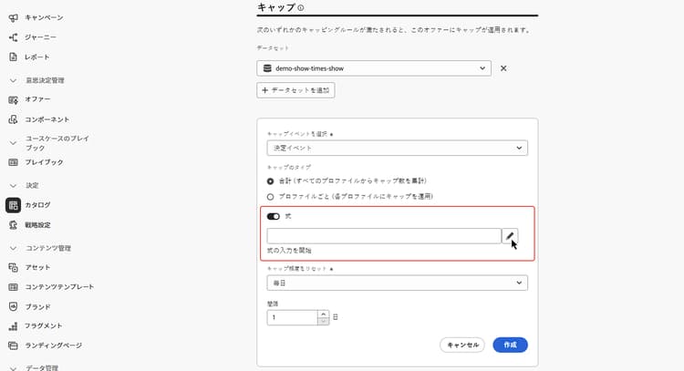 キャッピングルールは、決定項目を表示できる最大回数を定義する制約として使用されます。キャッピングルールで Adobe Experience Platform データを使用すると、動的な外部属性に基づいてキャッピング条件を定義できます。これを行うには、キャッピングルールで式を使用して、目的のキャッピングしきい値を計算します。