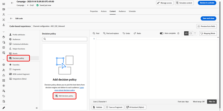 パーソナライゼーションエディターを開き、決定ポリシーを作成します。メールの場合、E メールデザイナーの専用メニューを使用して決定ポリシーを作成することもできます。 以下の節を展開して、2 つの方法を確認してください。