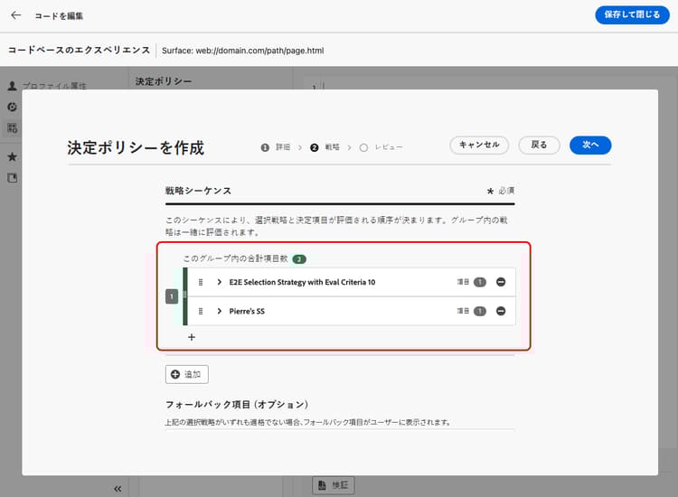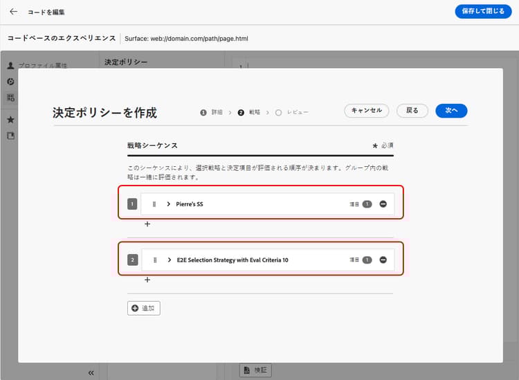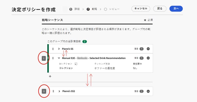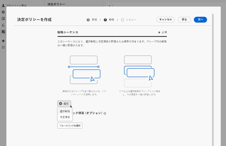 「戦略シーケンス」セクションでは、決定ポリシーと共に提示する決定項目を選択し、選択戦略を設定できます。