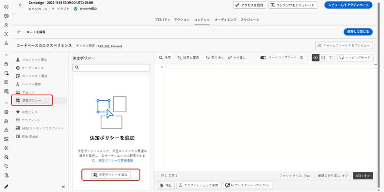 コードエディターから「決定ポリシー」を選択し、「決定ポリシーを追加」をクリックして、決定の詳細を入力します。詳細情報