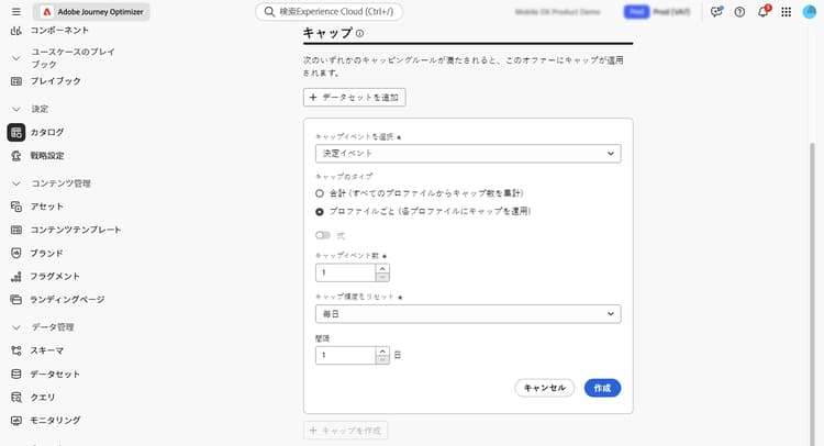 キャップは、オファーを提示できる最大回数を定義する制約として使用されます。ユーザーが特定のオファーを受け取る回数を制限すると、顧客への過度の勧誘を防ぎ、各タッチポイントをそれに適したオファーで最適化できます。特定の決定項目に対して最大 10 個のキャップを作成できます。