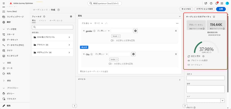 ワークスペースに新しいフィールドを追加および設定すると、オーディエンスのプロパティパネルに、オーディエンスに属する推定プロファイルに関する情報が表示されます。「予測を更新」をクリックして、データを更新します。