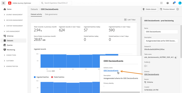意思決定管理イベントを含むデータセットから、DecisioningEvents XDM スキーマに直接アクセスできます。