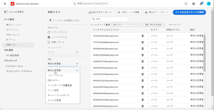 - 抑制リストは、配信から除外するメールアドレスの一覧です。これらのアドレスに送信すると、送信の評判や配信率が低下する可能性があるなどの理由から対象外にします。無効なアドレス、絶えずソフトバウンスしメールの評判に悪影響を与える可能性のあるアドレス、送信したメールメッセージに対して何らかのスパム苦情を出す受信者など、ジャーニーでの送信から自動的に除外されるすべてのメールアドレスを監視できます。抑制リストと再試行の管理方法については、それぞれのページを参照してください。