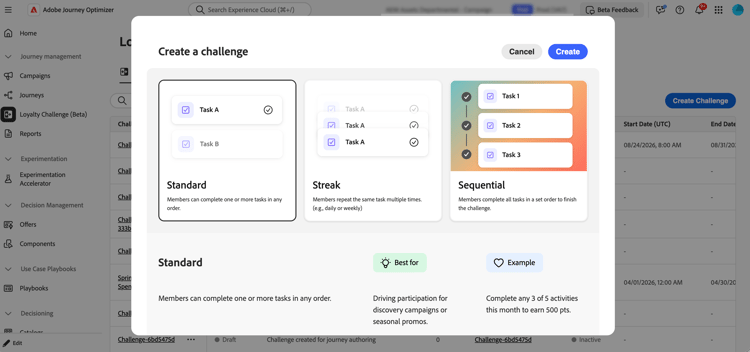 チャレンジの作成 – 名前、タイプ(標準、ストリーク、順次)、日付範囲など、基本的なチャレンジプロパティを定義します。
