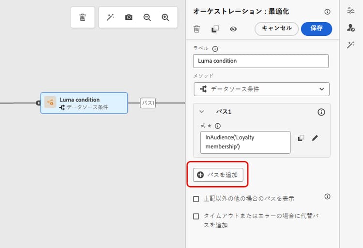 定義された条件に該当しないオーディエンス向けに、別のパスを作成するには、「上記以外の事例のパスを表示」をオンにします。