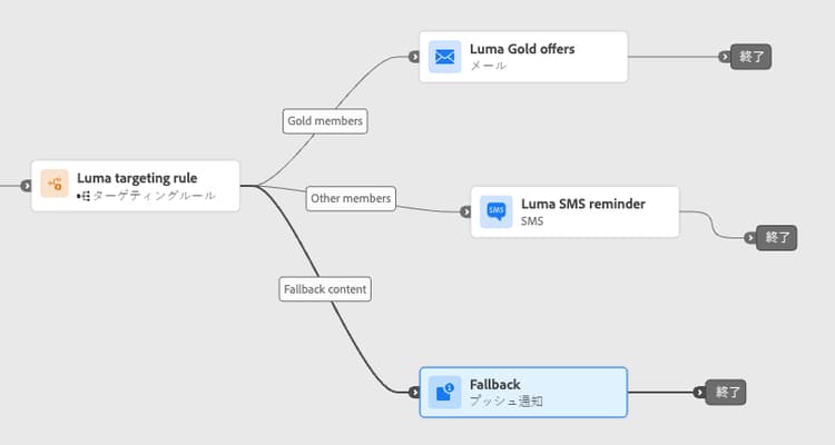 note note NOTE このオプションを選択しない場合、ターゲティングルールに選定されていないオーディエンスはフォールバックパスにエントリせずにジャーニーを終了します。 -